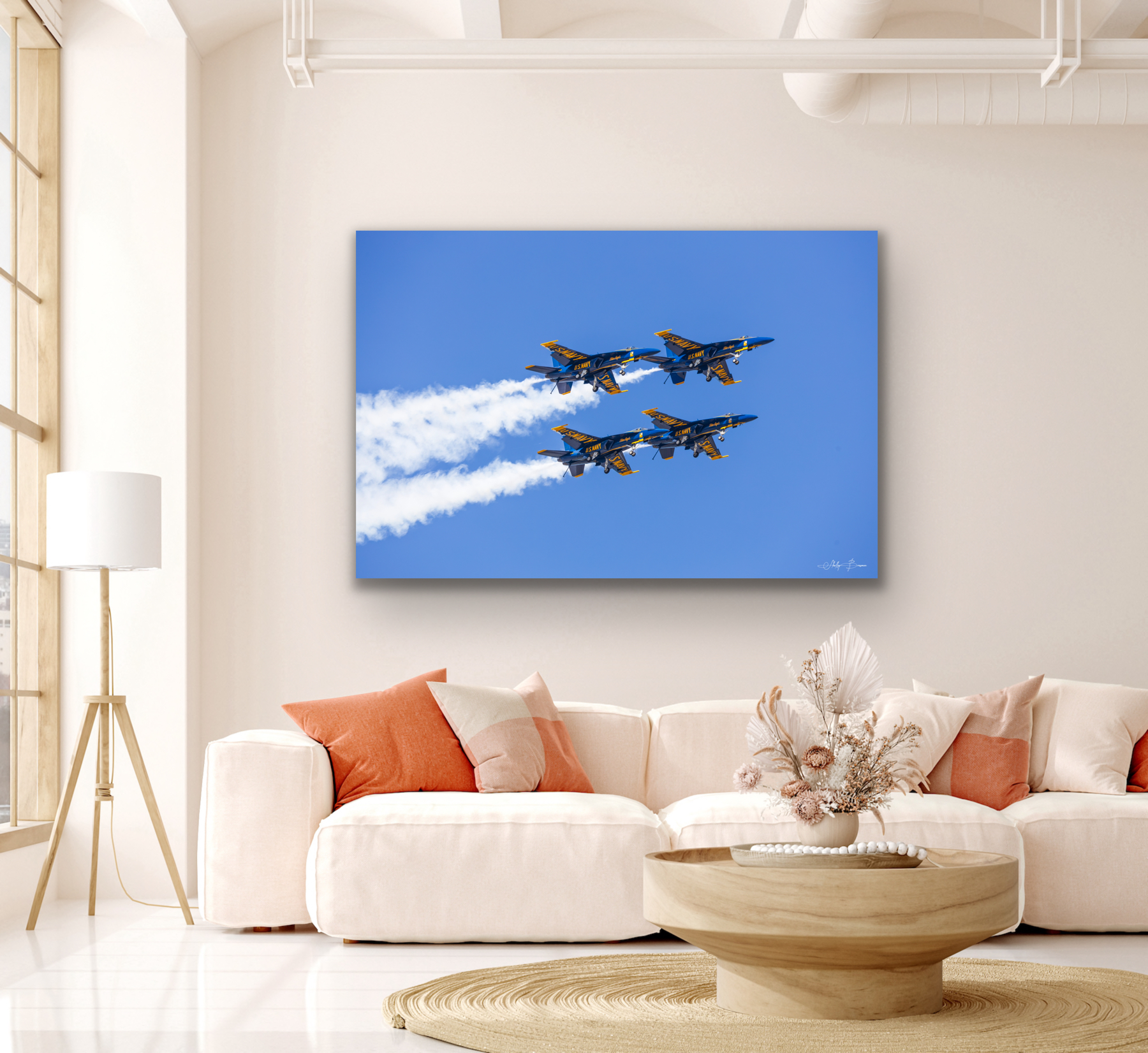 Indulge in the epitome of luxury wall art with our mesmerizing Blue Angels photograph, now available in a variety of exquisite mediums including canvas, metal, and acrylic. Printed on premium digital photo paper, this captivating image showcases the precision and power of the renowned Blue Angels aerobatic team in stunning detail. Elevate your space with a large-format print that commands attention and evokes a sense of awe. Whether you prefer the classic charm of canvas, the contemporary sophistication of metal, or the unparalleled brilliance of Lumachrome Acrylic, our Blue Angels photo is sure to captivate viewers and become a striking focal point in any room. Experience the thrill and elegance of the Blue Angels like never before with our luxury wall art collection.